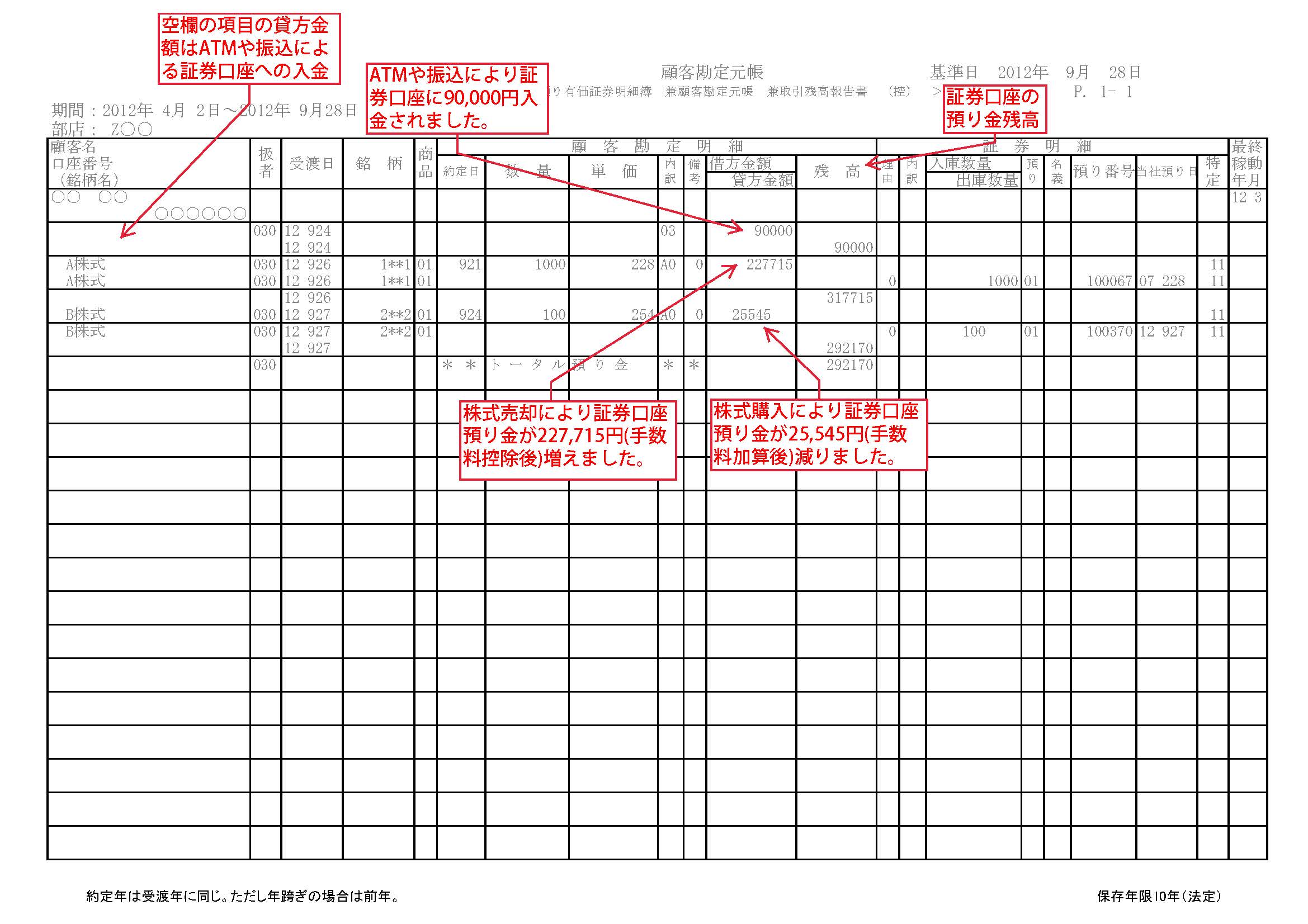 ここでは、証券会社口座の顧客勘定元帳の基本的な見方を簡単に説明いたします。顧客勘定元帳の様式は証券会社によってそれぞれかなり異なりますが、ここで基本的な見方を身に着けていただければ、あとは、それぞれの証券会社の注書きを読めば解読することが可能になるはずです。